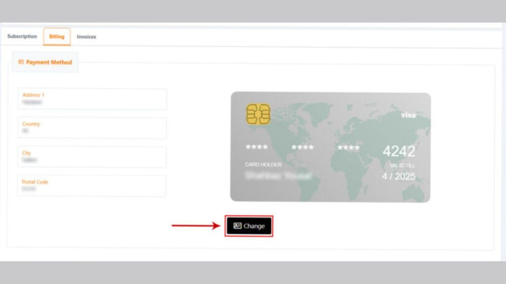 - Under the Billing tab, you will see a Change button next to your payment card information.