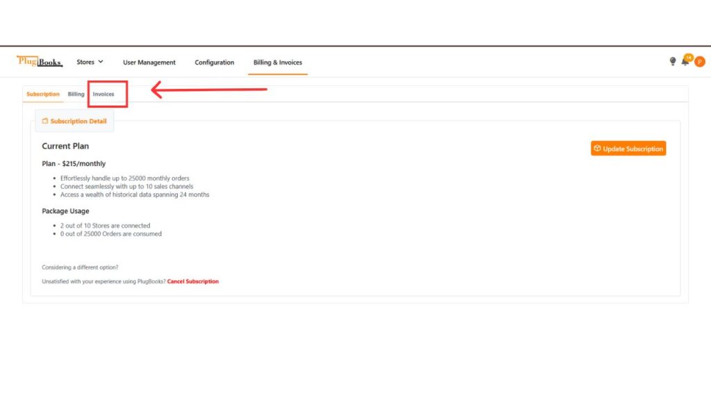 After opening the Billing & Invoices section, click on the Invoices tab. This tab contains all of your Plugbooks fee invoices.